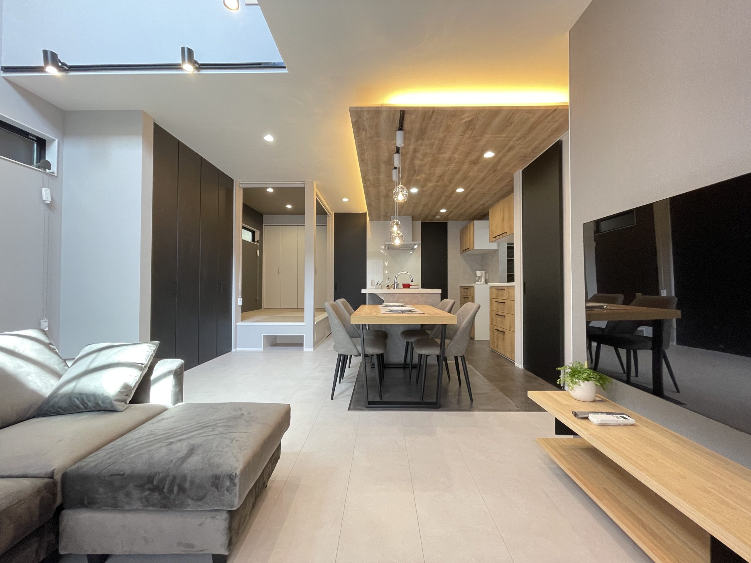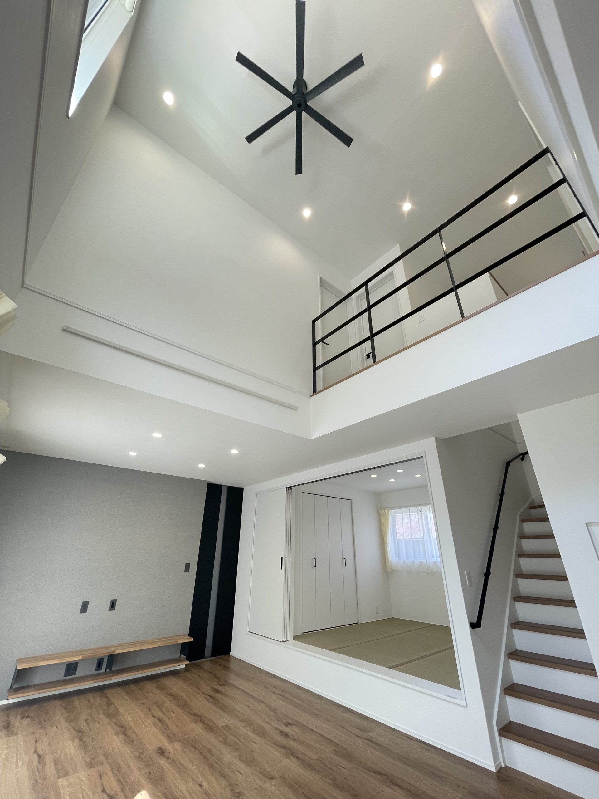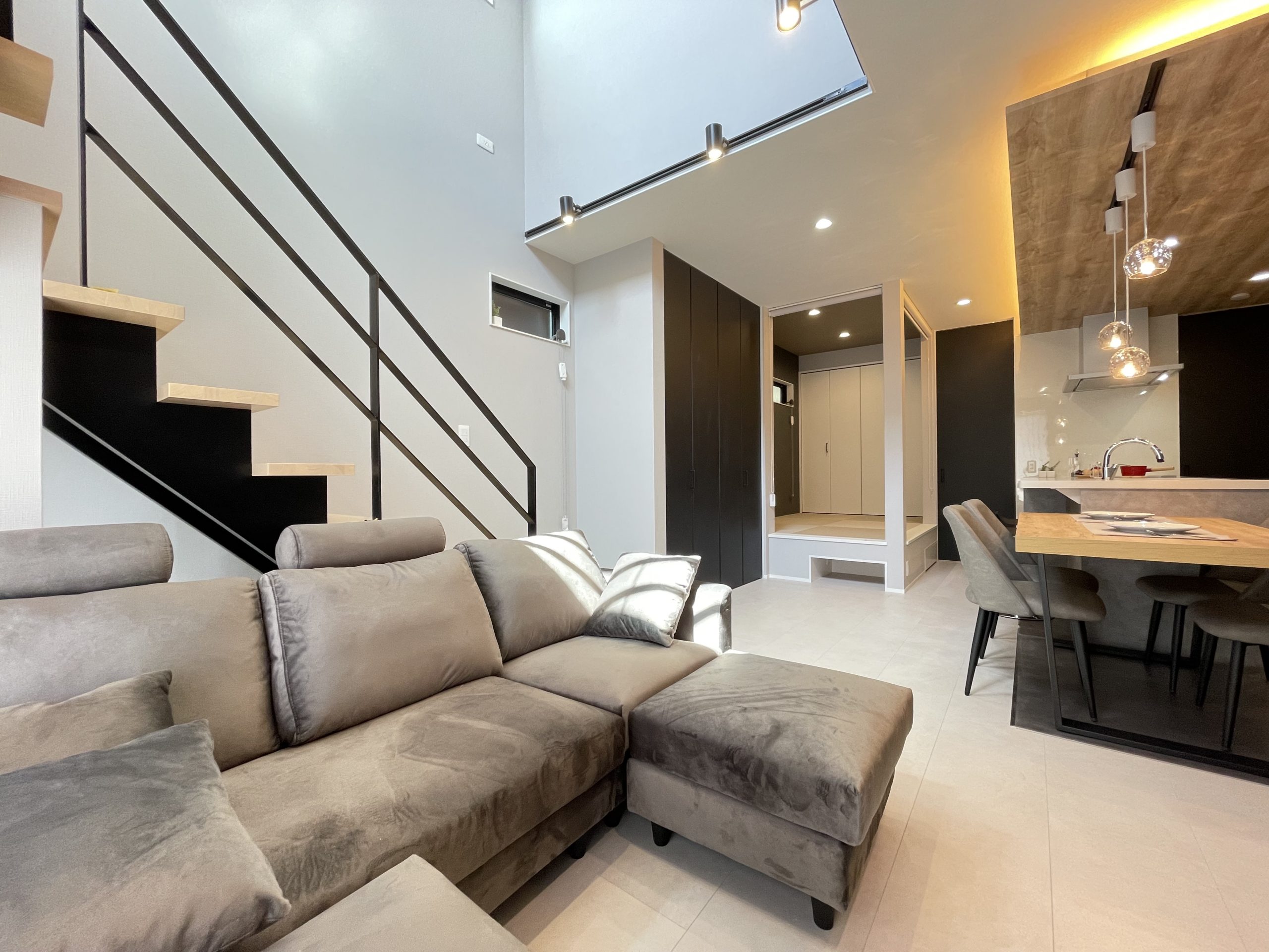 リビングは、吹抜け+スケルトン階段で開放的に。