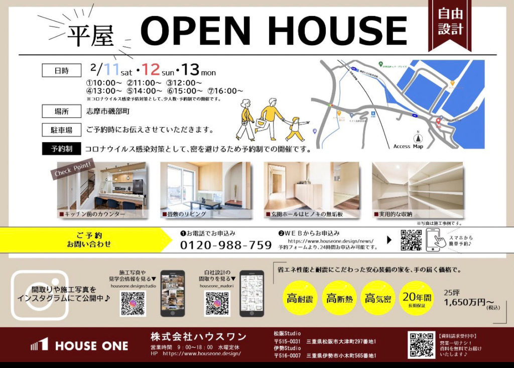 現在ハウスワンでは、『志摩市 磯部町』にて完成見学会を開催しております!