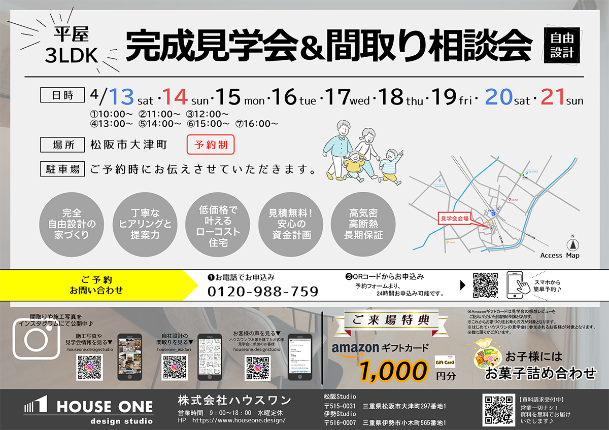 現在ハウスワンでは、松阪市大津町にて完成見学会&間取り相談会を開催を予定しております🏡✨