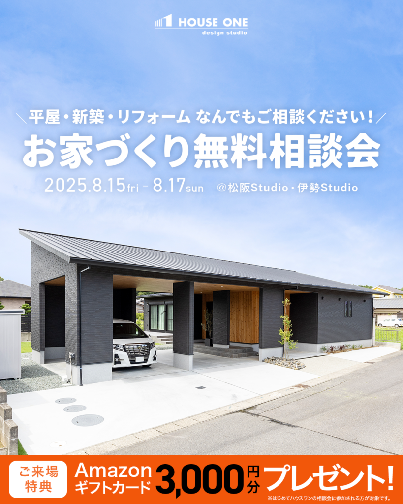 ハウスワン スタッフブログ 久しぶりの雨模様 投稿日: 2025年8月10日 ise-satishome いつもご覧いただきありがとうございます。 久しぶりの更新となってしまいました💦 本日は3連休の中日、昨日からお盆休みだという方も多いのではないでしょうか? あいにくの雨ではありますが、雨で少し気温が下がるだけで随分過ごしやすく感じられますね☔✨ まだまだ蒸し暑い日は続きますので、夏風邪・夏バテしないようお気をつけてお過ごしください🍀 さて、ハウスワンではお盆休み中も相談会・見学会の開催を予定しております!! ご予約受付中ですので、ぜひお気軽にご参加くださいませ🌟