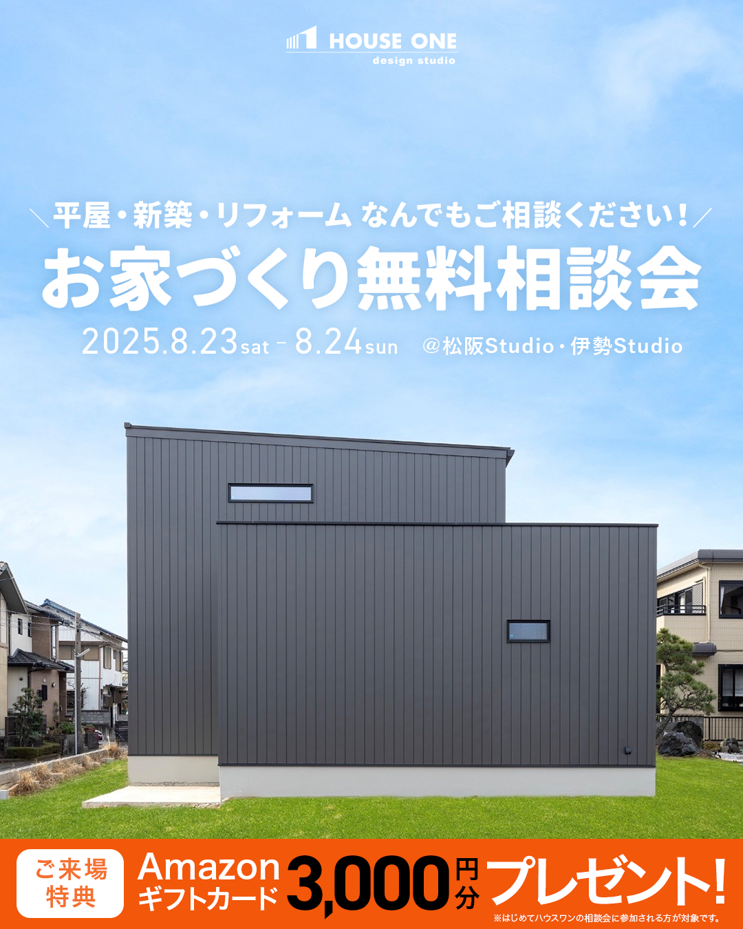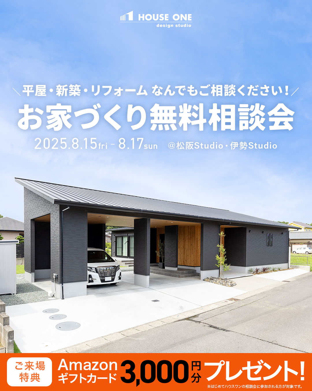 2025年8月15日(金)~8月17日(日)の3日間、ハウスワンの家づくり無料相談会を開催します。 ご予約はこちら。