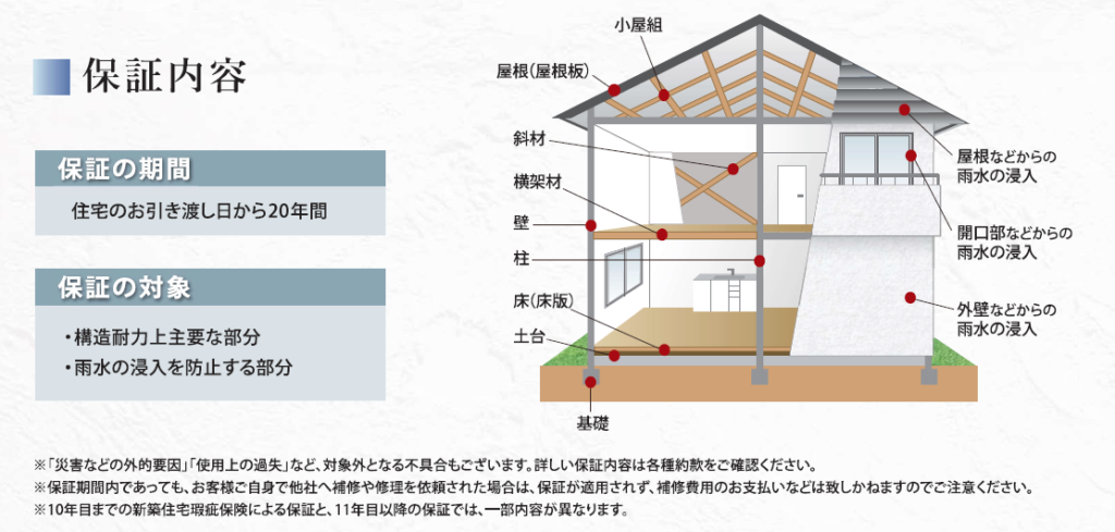「構造耐力上主要な部分」及び「雨水の浸入を防止する部分」に欠陥が発生した場合、瑕疵担保履行法に基づき、瑕疵の補修または賠償が10年保証されます。