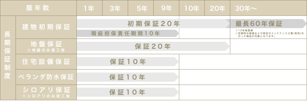 ※長期保証は、弊社指定の20年の有償メンテナンスを受けていただくことを条件に、保証期間を最長60年まで延長(10年毎更新)いたします。